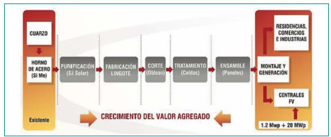 La articulación entre estos tres actores (político-productivo-científico) explica el interés creciente por desarrollar un polo científico-tecnológico provincial en materia fotovoltaica; intenciones que se cristalizan en una propuesta de industrialización a través de la fabricación de paneles solares en un esquema de integración vertical, es decir, dentro de una cadena completa de valor agregado única en Sudamérica. Esta cadena incluye desde la extracción del silicio como materia prima –obtenido del cuarzo disponible en el territorio provincial– hasta la obtención de obleas de silicio y las celdas para la elaboración de los paneles para luego abastecer proyectos locales, como residencias, comercios e industrias, así como centrales solares (ver Gráfico 1).