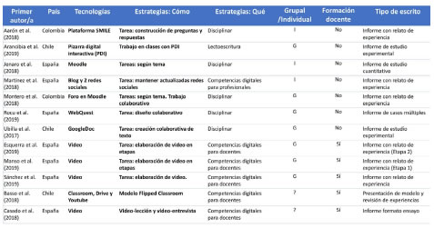 Adicionalmente, Anijovich y Mora (2010) mencionan que utilizan la denominación estrategias de enseñanza para destacar que no se trata de meras técnicas sino de decisiones enmarcadas en posicionamientos tanto teóricos como contextuales. Estos posicionamientos se ponen de manifiesto cabalmente en el primer grupo de textos analizados, estando dos vinculados a la descripción de cambios institucionales relacionados con la incorporación de tic (Carranza y Caldera, 2018; Marín et al., 2017), y los otros dos, a estudios sobre literatura especializada en el tema (Lizcano et al., 2019; Sánchez-Otero et al., 2019).