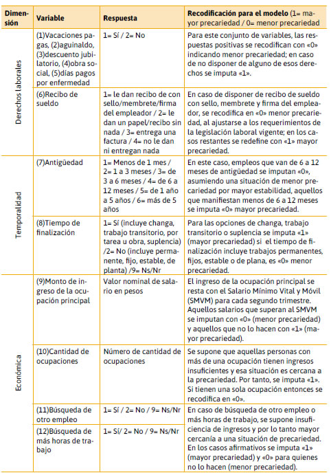 El primer paso consiste en operacionalizar el concepto de empleo precario a partir de las dimensiones: a) derechos laborales (disponibilidad de vacaciones pagas, aguinaldo, descuento jubilatorio, días pagos por enfermedad, obra social y recibo de sueldo), b) la temporalidad (antigüedad en el empleo y tipo de empleo) y c) la económica (ingreso total de la ocupación principal, cantidad de ocupaciones, búsqueda de más empleo u horas para trabajar).
