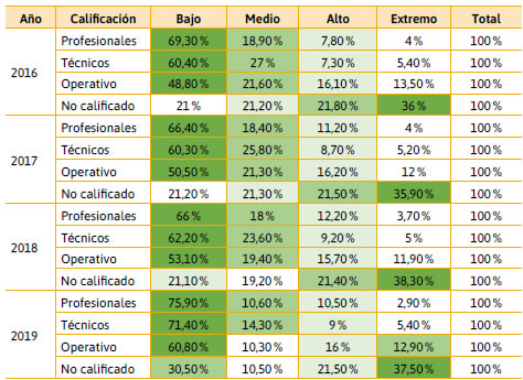 En cuanto al nivel precario alto, las calificaciones profesionales ubican frecuencias menores a los niveles anteriores, pero interanualmente en ascenso, iniciando 2016 con el 7,8 % y ubicándose con el 12,2 % en 2018, para descender a 10,5 % en 2019; por último, en el nivel precario extremo se mantiene con el 4 % durante 2016 y 2017, disminuyendo a 3,7 % y 2,9 % en 2018 y 2019. Los años donde se exhiben mayores niveles de precariedad para este indicador son 2017 y 2018.