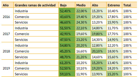 • En cuanto a las grandes ramas de actividad, lidera comercio en todos los años en los niveles alto y extremo, aunque debemos destacar un incremento sostenido en el nivel extremo para industria.