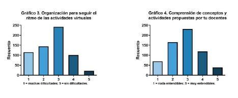 Para las variables de análisis propias del estudiantado como su propia organización para seguir el ritmo de las actividades virtuales (Gráfico 3) y la comprensión de conceptos y actividad propuestas por docentes (Gráfico 4), si bien se observa que la mayoría de las respuestas se concentra en un valor de moda igual a 3 (38,8% y 37%, respectivamente), hay una mayor proporción de respuestas negativas [1-2] (41,5% y 37,6%, respectivamente) en relación con las respuestas positivas [4-5] (19,7% y 25,4%, respectivamente). Asimismo, se observa una escasa tendencia a indicar la respuesta 5 (3,5% y 6,3%), que indica la mejor valoración.