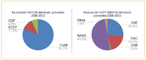 En el período comprendido entre 2006 y 2015, se incrementaron los ingresos por vytt en la cnea de acuerdo a la facturación declarada en las memorias anuales de la institución en el marco de la Ley N.º 23.877, que se observan en el Gráfico 3. Estos ingresos se duplicaron, pasando de 7,5 a 15 millones de dólares estadounidenses entre 2006 y 2015, respectivamente. Entre las uvt que realizaron la administración de estos ingresos, se reportan la fjab, el Foro de Ciencia y Tecnología para la Producción, la Cooperativa del Departamento de Física y el Polo Tecnológico Constituyentes. En el Gráfico 4, se señala que el promedio facturado por la fjab en esos años representó el 81,7 % del total. De hecho, entre el 77 y el 89 % del total facturado en cada uno de esos años corresponde a los montos administrados por esa uvt, lo que la convierte en la más representativa de las actividades de vytt.
