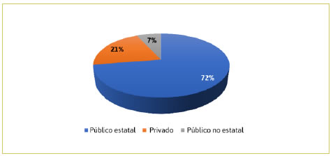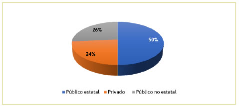 Tal como se observa en la Figura 4, dentro de los cambios acaecidos en los pio del pf ii se cuenta una distribución diferente y más equilibrada de los sectores de instituciones vinculadas, en comparación con lo sucedido en pf i: público estatal (50 %), público no estatal (26 %) y privado (24 %). Además, puede advertirse, de una parte, la inclusión de instituciones pertenecientes al sistema de salud, aunque aún en bajo porcentaje, siendo dos hospitales en total, y, de otra, la incorporación de un organismo público como el Servicio Nacional de Sanidad Agraria, instituciones que anteriormente no habían sido seleccionadas como destinatarias de la vinculación. En el ámbito público estatal, de los diez proyectos asociados a este ámbito, el organismo gubernamental con más vinculaciones es el Municipio de Tandil (50 %), puntualmente, su Dirección de Medio Ambiente, al igual que en la convocatoria del pf i. Luego, en cantidad de proyectos le siguen los municipios de Olavarría (30 %) y Azul (20 %).