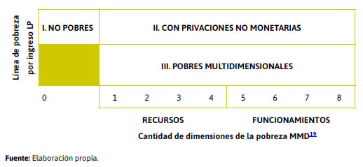 En conjunto las dimensiones de multidimensionalidad, capacidades y derechos amplían el alcance de la noción de pobreza concebida tradicionalmente desde la insuficiencia material del ingreso monetario, para pasar al plano de las capacidades que poseen los individuos y que les permite «ser y hacer» en libertad artífices de sus anhelos, con un estado y sociedad que les garanticen la titularidad de derechos humanos para superar la condición de pobreza.
