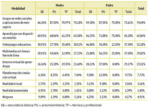 La percepción de las modalidades varía estadísticamente en cada tipo de educación χ2 (18, N = 285) = 57,178, p = 0,000. En la educación preuniversitaria, predominan los grupos en redes sociales o aplicaciones de mensajería y las multimedias sobre el resto; en la secundaria básica, la participación en ninguna modalidad.
