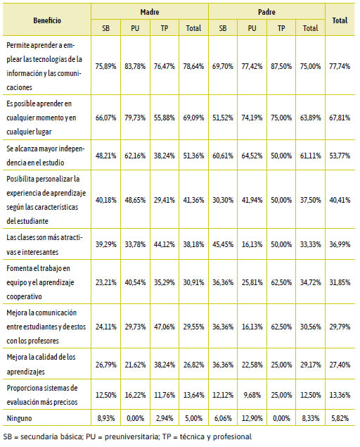 Los principales beneficios percibidos son que la educación digital permite aprender a emplear las tecnologías de la información y las comunicaciones, es posible aprender en cualquier momento y en cualquier lugar y se alcanza mayor independencia en el estudio. Las diferencias son estadísticamente significativas según el tipo de educación χ2 (20, N = 292) = 40,016, p = 0,001, destacando la secundaria básica en las madres y el preuniversitario en los padres como las enseñanzas en las que se identifica en mayor medida la ausencia de ventajas.