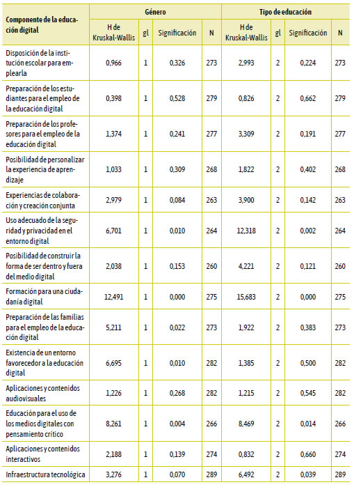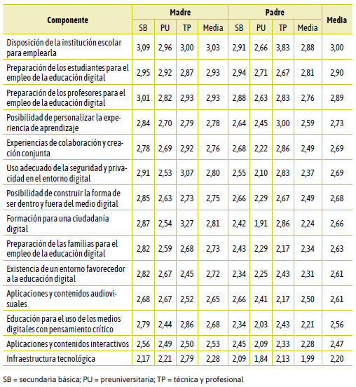 Todos los componentes son valorados de manera más favorable por las madres, con diferencias estadísticamente significativas (Tabla 8) para el uso adecuado de la seguridad y privacidad en el entorno digital, la formación para una ciudadanía digital, la preparación de las familias para el empleo de la educación digital, la existencia de un entorno favorecedor a la educación digital y la educación para el uso de los medios digitales con pensamiento crítico.