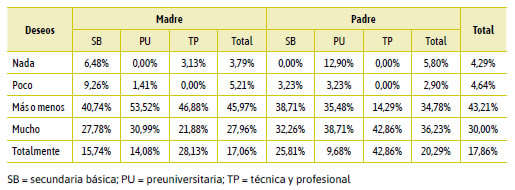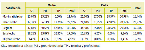 A nivel global la satisfacción tiende a un punto medio. Las diferencias suceden tanto en lo que respecta al género χ2 (4, N = 292) = 18,982, p = 0,001 como al tipo de educación χ2 (8, N = 292) = 23,272, p = 0,003. En el primer caso, los padres son los más insatisfechos; en el segundo, a nivel de la educación preuniversitaria se manifiesta mayor insatisfacción y en la técnica y profesional, mayor satisfacción.