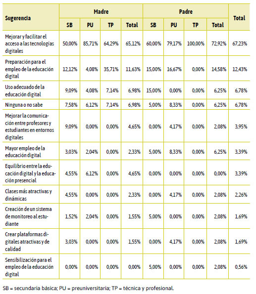 Predomina ampliamente el deseo de observar mejoras en el acceso a las tecnologías digitales, seguida de la preparación para el empleo de la educación digital. Esta pregunta tuvo 119 datos perdidos, lo cual se interpreta como un desconocimiento de los sujetos en cuanto a qué recomendar. Las diferencias, estadísticamente significativas según el tipo de educación χ2 (24, N = 177) = 36,743, p = 0,046, apuntan a una mayor preocupación por cuestiones de acceso a las tecnologías en las madres de educación preuniversitaria y los padres de técnica y profesional, de preparación en las madres de enseñanza técnica y profesional y de uso adecuado de la educación digital en los padres de estudiantes de secundaria básica.