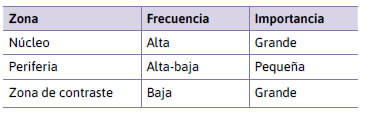 Finalmente cabe destacar que, como puede observarse en la Tabla 2, a la zona periférica ingresan las categorías con importancia pequeña pero con frecuencias tanto altas como bajas. Esto, en el marco de las RS, se debe a que dentro de esta zona hay categorías que fortalecen la significación del núcleo por su alta frecuencia, y otras que, por tener menor frecuencia, se vinculan con las características individuales de los sujetos y las características del contexto.