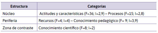Como puede observarse, la estructura nuclear de la RS está compuesta por las categorías Procesos y Actitudes y características, mientras que la periferia está relacionada con elementos de las categorías Recursos y Conocimiento pedagógico. La zona de contraste de esta RS está compuesta exclusivamente por evocaciones de la categoría Conocimiento científico.