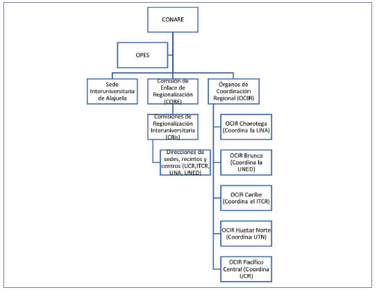 La estructura organizativa del modelo de regionalización se compone del conare, la Comisión de Vicerrectores de Extensión y Acción Social (veas), la Comisión de Enlace Regionalización (core) y los Comités Interuniversitarios (ci). La veas cuenta con un equipo coordinador, el core, integrado por representantes de cada universidad miembro del conare y un representante de la Oficina de Desarrollo Institucional (odi) del conare, que actúa como nexo entre este y los ci. A su vez, cada ci incluye a los directores o sus representantes de las sedes, recintos y centros universitarios de las regiones priorizadas.