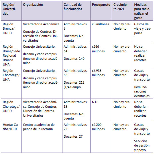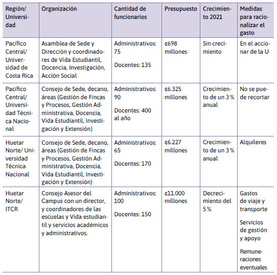 • En cuanto a estructura organizativa, las universidades ucr, itcr, una y utn operan mediante un Consejo o Asamblea de Sede o Campus subordinado a la Rectoría, con un decano y directores por área. Esta estructura se replica en menor escala en las sedes centrales. En contraste, la uned adopta un modelo más simplificado en sus centros universitarios, dirigidos por la Dirección de Centros Universitarios y subordinados a la Vicerrectoría Académica.