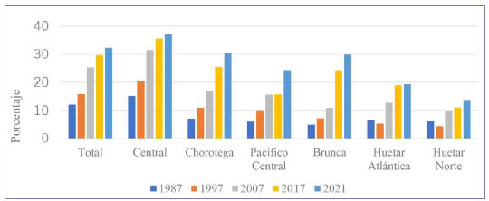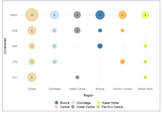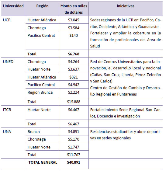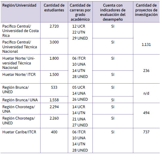 La caracterización de las universidades públicas en las distintas regiones de Costa Rica revela cuatro aspectos fundamentales: en primer lugar, la presencia universitaria estatal se extiende a través de 72 sedes o recintos, lo cual juega un papel crucial en el estímulo del desarrollo regional. Segundo, la inversión en las regiones ha experimentado un crecimiento significativo impulsado por el proyecto de Mejoramiento de la Educación Superior del Banco Mundial, que asignó cerca del 20 % de los recursos para infraestructura a las sedes fuera de la Gran Área Metropolitana (gam). Sin embargo, esta no es la única inversión que las universidades estatales dedican a la regionalización. conare ha asignado 21.252 millones de colones desde 2007 del Fondo del Sistema a proyectos regionales. Tercero, en lo que respecta al presupuesto asignado por las universidades públicas a las regiones, fue imposible obtener la información precisa del monto destinado en las regiones a las actividades sustantivas de todas las universidades públicas, esto por la forma de presupuestación centralista. Sin embargo, se obtuvo un dato aproximado: la Universidad de Costa Rica (ucr) destina el 19,96 % de su presupuesto a las regiones, el itcr el 20 % y la una el 9,9 %. Aunque estos fondos se aplican a las operaciones ordinarias de sus respectivas sedes y recintos, los entrevistados indicaron que estos no permiten un margen suficiente para la expansión de la oferta académica ni para el fortalecimiento de la inversión en investigación y extensión social. Cuarto, se ha conseguido cuantificar el número de proyectos de investigación en desarrollo a nivel regional. Aunque se dispone de información sobre las universidades y las instituciones asociadas en algunos casos, aún no se cuenta con datos concretos sobre el impacto de estos proyectos en los sistemas de innovación regional.