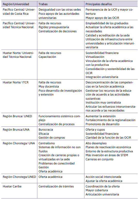 La regionalización universitaria enfrenta cinco desafíos principales: sostenibilidad financiera, gestión de sedes, oferta académica, articulación interuniversitaria y gobernanza. En términos de sostenibilidad financiera, las universidades se han centrado en la docencia, dejando un vacío en áreas cruciales como la investigación y, en menor medida, la extensión, debido a prácticas de presupuestación centralizadas. La gestión de las sedes regionales a menudo replica ineficientemente la estructura administrativa de las sedes centrales, como se observa en instituciones como la ucr, la una y el tec, y en menor grado en la utn. La uned adopta un enfoque más administrativo, lo que puede restringir la agilidad y aumentar los costos y la burocracia. En cuanto a la oferta académica, es imperativo actualizarla continuamente para alinearla con las necesidades económicas, sociales y de mercado, actuales y futuras, de cada región. Se observa una demanda clara por parte de estas regiones por carreras innovadoras que sean interdisciplinarias, de corta duración y con un fuerte componente tecnológico. En cuanto al desafío de la articulación interuniversitaria, es crucial que las instituciones educativas evalúen colectivamente sus capacidades en términos de recursos físicos, financieros y humanos. Esto permitirá capitalizar las economías de escala y optimizar los recursos disponibles en cada universidad regional. A pesar de que la normativa ha fomentado la articulación regional durante más de cinco décadas, aún no se ha establecido un modelo efectivo que facilite la articulación interuniversitaria en áreas claves y el progreso ha sido limitado, a pesar de iniciativas como la descentralización de carreras, programas itinerantes y los posgrados conjuntos. Otro desafío significativo es el fomento de la investigación y la extensión desde las sedes regionales, que, si se realiza de manera articulada entre las universidades, podría mejorar significativamente la respuesta a las necesidades locales y la retroalimentación de resultados. Esto, a su vez, reforzaría el rol de las universidades como agentes clave en el desarrollo local. Es recomendable llevar a cabo una evaluación de los indicadores de impacto de los proyectos de investigación y extensión para determinar su efectividad en cada región.Finalmente, la gobernanza de las universidades públicas regionales requiere de una planificación estratégica que promueva una descentralización tanto eficiente como efectiva, alineada con una visión de desarrollo para la educación superior en las regiones. Esto es imperativo no solo debido a las restricciones fiscales exacerbadas por la pandemia de covid-19, sino también porque la ineficiencia limita el alcance y el progreso de la regionalización educativa.