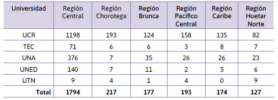 Las instituciones de educación superior estatal tienen una amplia presencia en el país, distribuidas en 72 sedes regionales. La región Central destaca por tener la mayor concentración, con un total de 31 sedes. Las regiones Chorotega y Brunca también cuentan con una significativa presencia universitaria.