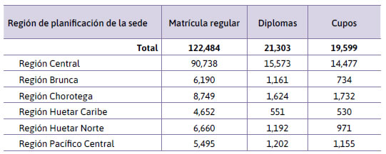 Con respecto al comportamiento de la matrícula, diplomas y cupos, en el siguiente cuadro se presentan los datos, pero sigue predominando la Región Central con mayores oportunidades en relación con las regiones periféricas.