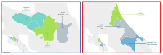 Las regiones se caracterizan por una diversidad de conglomerados productivos, cada uno con sectores económicos predominantes. En la Médula Económica, los sectores más destacados incluyen la manufactura, el comercio, los servicios profesionales y científicos, el sector inmobiliario, así como las finanzas y seguros. El Nodo Central y Pacífico se centra en la manufactura, el comercio, las finanzas y seguros, la educación y el sector inmobiliario. Por su parte, el Nodo Atlántico y Sur se distingue por su enfoque en la agricultura, la manufactura, la construcción, la educación y el transporte. En el Nodo Chorotega, los sectores predominantes son la construcción, la manufactura, el turismo, la generación de electricidad y la agricultura. Finalmente, el Corredor Norte y el Corredor Sur, ambos considerados desarticulados, comparten una concentración en la agricultura, la educación y la manufactura, con la adición de la construcción en el Corredor Sur.