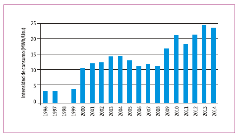 Figura 6. Variaciones en la intensidad del consumo eléctrico en el sector industrial. Período 1996-2014