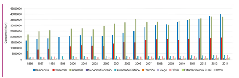 del 12 % al 17 % (39 476 MWh a 203 648 MWh) y el sector riego del 12 % al 14 % (equivalentes a 38 976 MWh y 164 809 MWh), mientras que se observa una disminución en el consumo del sector industrial, ya que en 1996 se apropió del 37 % del total consumido y en 2014 del 23 % (122 789 MWh y 272 787 MWh respectivamente).
