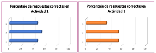 Figura 1. Gráficas del análisis de la información de la actividad 1 del grupo A (color azul) y del grupo B (color naranja)
