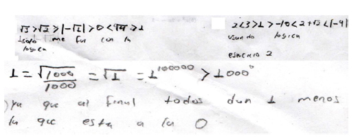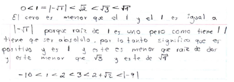 Por otro lado, en la otra mitad de los alumnos de cada grupo, quienes tienen más deficiencias, se incluye al estudiante B-10, quien tiene algunas dificultades con respecto al ordenamiento de los números reales. El alumno B-10 escribió 2<3>1>−10<2+√2<|−9|, ver la Figura 3. Con base en las propiedades de las desigualdades enunciadas en Protter y Morrey (1980), este estudiante no escribe correctamente la relación que existe entre los números. Él anotó dos relaciones contrarias, es decir, es menor que (<) y es mayor que(>) en una misma expresión matemática, para comparar dichos números, lo que muestra confusión por parte del alumno. Él debió escribir: