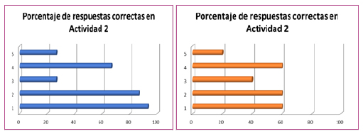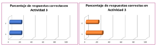 Figura 7. Gráficas del análisis de la información de la actividad 3 del grupo A (color azul) y del grupo B (color naranja)