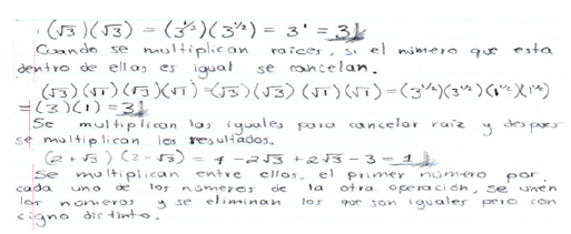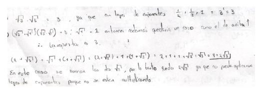 En la segunda actividad sobre la realización de operaciones aritméticas con dichos elementos de este conjunto, la cual determina la construcción del ProCog 2, los datos de la Tabla 6 y la Figura 4 permitieron constatar que ambos grupos tenían los conocimientos básicos, puesto que en las preguntas uno, dos y cuatro, sobre la multiplicación de los números reales definidos por las raíces cuadradas de números reales positivos y/o números enteros, los estudiantes las respondieron con muchas claridad, porque las raíces cuadradas desaparecen usando la ley de los exponentes, y los números reales resultantes son defnidos por números enteros, los cuales son muy fáciles de manipular por parte de ellos, como lo muestran las figuras 5 y 6. Sin embargo, en las preguntas tres y cinco sobre la suma o la división de números reales definidos por las raíces cuadradas de números reales positivos y/o enteros, más de la mitad de ambos grupos no las contestaron correctamente, esto, debido a que no desaparecen las raíces cuadradas en la expresión matemática, lo que implica que ellos tuvieron algunos problemas para realizar operaciones