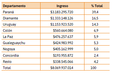 En conclusión, el nhce genera un nivel de ingresos altamente significativo en Entre Ríos, pero marcado por una cuádruple concentración interrelacionada: geográfica, sectorial, temporal e individual. El departamento Paraná es dominante en la generación de ingresos según el lugar de radicación de las entidades; las cooperativas productivas lo son en cuanto a la distribución sectorial; en el aspecto temporal, aquellas entidades nacidas antes de 1970 explican la mayor parte de los recursos y en términos de cooperativas individuales, el 20 %, las más grandes, generan el 93,8 % del ingreso.