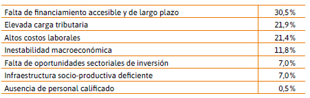 El formulario nos permitió relevar las razones de la relativamente baja tasa de inversión respecto del valor agregado. En efecto, ante la consulta a las cooperativas sobre cuáles consideran que constituyen los principales limitantes para la inversión productiva, los resultados muestran que el 30,5 % de las cooperativas relevadas seleccionó la falta de financiamiento accesible y de largo plazo como primera o segunda causa de la restricción a la inversión, mientras que el 21,9 % seleccionó la elevada carga tributaria en primer o segundo lugar y el 21,4 % el problema de los altos costos laborales. A su vez solo el 11,8 % eligió en el primer o segundo lugar la inestabilidad macroeconómica, el 7 % la infraestructura socio-productiva deficiente (rutas, puertos, energía, etc.), el 7 % la falta de oportunidades sectoriales de inversión y el 0,5 % la falta de personal calificado. Ante la opción de otras causas, no hubo respuestas, por lo cual las opciones dadas en el formulario cubrieron razonablemente las problemáticas de la inversión.