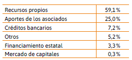 En forma coherente con las respuestas sobre las causas de la limitación de la inversión, la información que arroja el relevamiento sobre las fuentes de financiamiento de la formación de capital indica el peso dominante de los recursos propios. Se trata de un aspecto sumamente importante, en la medida que muestra las restricciones efectivas al avance de proyectos de inversión posibles con adecuado financiamiento. Casi el 60 % de la inversión se financia con recursos propios, quedando en segundo lugar el aporte de los asociados, mientras que apenas el 7,2 % se realiza con créditos bancarios. El mercado de capitales tiene una incidencia marginal, como era de esperar (Tabla 6).