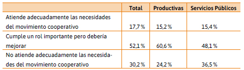 El problema de la inversión, además, está relacionado directamente con el rol del Estado. Frente a esta situación, el movimiento cooperativo muestra cierta disparidad. En efecto, ante la pregunta de si el Estado atiende adecuadamente las necesidades del movimiento cooperativo, sólo el 17,7 % opinó favorablemente (Tabla 7). Las cooperativas de servicios públicos son las más disconformes con el rol del Estado.