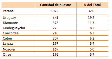 Como era de esperar, la distribución de los puestos de trabajo en términos individuales está menos concentrada que la distribución del ingreso, pese a lo cual continúa reflejando un nivel alto de concentración, con un Gini de 0,78. A su vez, en términos geográficos, la distribución del empleo directo sigue una lógica similar, fuertemente concentrada en las cooperativas radicadas en Paraná, Uruguay y Diamante, aunque menos concentrada que el ingreso total (Tabla 10).