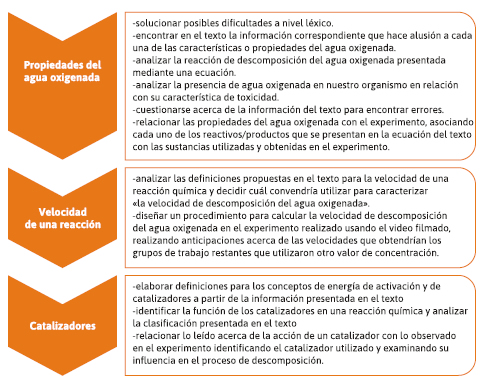 En la tercera instancia de reflexión los docentes trabajaron con tareas de lectura, organizadas en una serie de actividades propuestas, elaboradas con el objetivo de favorecer la comprensión del material escrito y de guiarlos para que establezcan relaciones con el experimento, como mencionamos anteriormente. Agrupamos las actividades teniendo en cuenta las tres secciones del texto, «Propiedades del agua oxigenada», «Velocidad de una reacción» y «Catalizadores», como se observa en la Figura 2.