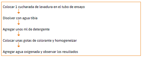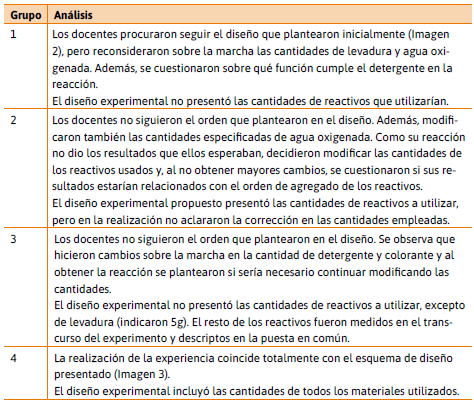En la actividad experimental a realizar al mezclar peróxido de hidrógeno (agua oxigenada) con un fermento realizado con levadura (que actúa como catalizador), se acelera la descomposición del peróxido, produciéndose una espuma que se puede visualizar mejor al agregar detergente y colorante. Las actividades realizadas en esta instancia incluyeron una puesta en común donde cada grupo presentó su diseño experimental, indicando las decisiones tomadas y analizando el resultado de la reacción. Se compararon los resultados obtenidos por los diferentes grupos, con el objetivo de determinar las variables intervinientes y la relación entre ellas. Por último, los docentes reflexionaron sobre las posibilidades de que ocurra esta reacción química en la vida cotidiana, las precauciones a tener en cuenta a la hora de manipular los reactivos y la necesidad de realizar cambios en el protocolo del tpl que elaboraron, de acuerdo a las características de los estudiantes y de la institución en donde trabajan.