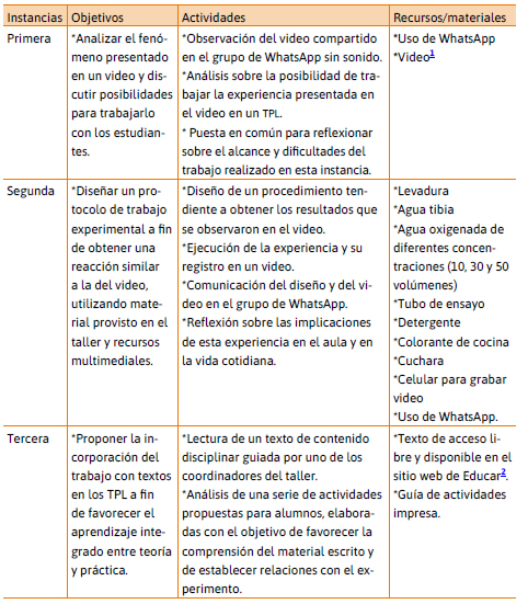 Al iniciar el taller se conformó un grupo de WhatsApp con los coordinadores y participantes, en el cual se compartieron todas las actividades que se realizaron durante el taller. El mismo se organizó en tres instancias, cada una de las cuales incluyó momentos orientados a la reflexión de los docentes sobre su propia práctica en el aula (ver Tabla 1).