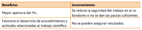 Según las características que presente el tpl, será el tipo de aprendizaje que se vea favorecido. De esta manera, si el protocolo es muy pautado, tipo «receta» o con un bajo nivel de apertura (Herron, 1971; Priestley, 1997; Zorrilla, 2019), donde la participación principal corresponde al docente, se promueven en los estudiantes demandas cognitivas bajas. En otro extremo, los protocolos con menor cantidad de pautas o mayor nivel de apertura, y donde la realización esté centrada en los estudiantes, pueden promover procesos cognitivos de mayor orden (Jiménez, Llobera y Llitjós, 2006; Zorrilla, 2019), facilitando así la comprensión de los fenómenos naturales más allá de la simple observación, demostración y manipulación de materiales de laboratorio. Este tipo de tpl implica contextualizar situaciones, considerar la creatividad de los estudiantes, analizar y cuestionar los procesos realizados, reflexionar sobre los resultados obtenidos, entre otras características (Rivarosa y Astudillo, 2013). Los tpl como aproximación a la investigación, permiten que los estudiantes formulen preguntas e hipótesis, pongan a prueba sus explicaciones, consideren explicaciones alternativas y comuniquen resultados (Tenreiro y Marques, 2006). De esta manera, el trabajo en el laboratorio deja de ser solamente un trabajo «experimental», integrando, a la vez, otros aspectos de la actividad científica igualmente esenciales (Carrascosa y otros, 2006).