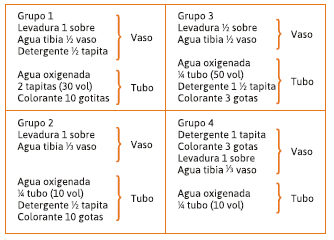 En la segunda instancia de reflexión los docentes replicaron la experiencia presentada en el video. Cada grupo contó con un kit de materiales, entre los cuales solo variaba la concentración del agua oxigenada. Estos kits fueron repartidos de manera aleatoria entre los grupos. De esta forma, los docentes diseñaron sus protocolos decidiendo acerca de las cantidades de reactivos a utilizar y procedimiento a seguir. Al finalizar esta etapa, se realizó una puesta en común en la que se anotaron en el pizarrón los materiales y reactivos consensuados al interior de cada grupo, según se muestra en la Figura 1.