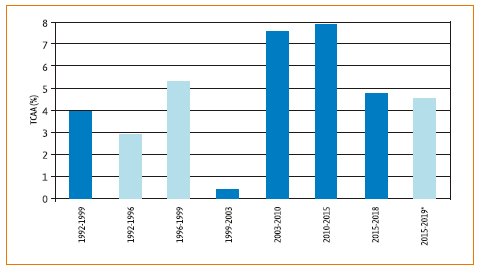 La carrera del investigador de conicet se crea en 1960 y para 1966 contaba ya con 283 miembros, mientras que 20 años más tarde esta cifra treparía a los 2.149 científicos (conicet, 2006). En el Figura 2 puede apreciarse la evolución del número de investigadores desde 1992 hasta la fecha. Varias de las dinámicas más generales antes señaladas se ven reflejadas en el devenir de la planta de investigadores de conicet, aunque también pueden distinguirse algunos subperiodos históricos con ciertas particularidades, los cuales se manifiestan (Figura 3) en diferentes tasas de crecimiento anual acumulativo (tcaa)8