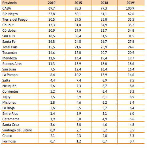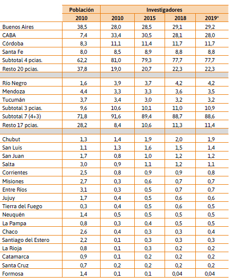 or su parte, de 2015 a 2019 (estimado11) las 17 provincias más atrasadas solo estarían ganando poco menos de un punto porcentual entre los investigadores de carrera. Al igual que antes, esto último se explica mayormente por la contracción relativa de la caba, puesto que inclusive aumenta un poco el peso de las provincias de Buenos Aires, Córdoba, Río Negro, Mendoza y Tucumán (esta última, no obstante, permanece aún por debajo de su porcentaje en 2010).