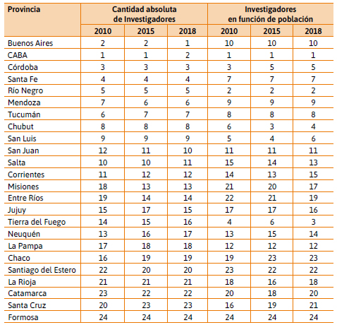 No obstante, como se observa en la Tabla 3, las dos provincias anteriores representan los principales ejemplos de cambios entre rankings. En tanto, para la mayoría de las restantes jurisdicciones del país las posiciones relativas son similares o cercanas, ya sea que se ordene por el número absoluto de investigadores o por su relación con la población provincial. Como es usual, las provincias patagónicas suelen subir algunos puestos al pasar de un ranking al otro, a raíz de sus menores niveles poblacionales. Aún así, 8 de las 9 jurisdicciones con mayor cantidad de investigadores se mantienen entre las mismas ubicaciones al relativizar por habitantes, con la excepción precisamente de la provincia de Buenos Aires. Si miramos las últimas 12 provincias, salvo el mencionado caso de Tierra del Fuego, ocurre lo mismo.