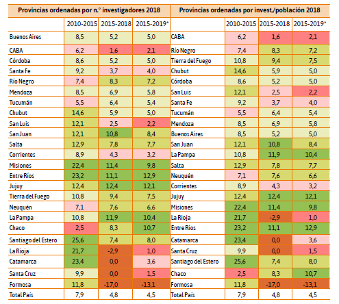 En cambio, la caba es el único caso que se mantiene de forma sostenida entre los rojos y las provincias de Buenos Aires, Córdoba y Mendoza entre los verdes pálidos. Con verdes más intensos en ambos periodos figuran Misiones, Entre Ríos, Jujuy, Santiago del Estero, San Juan y Salta, provincias en las que se podría hablar de un mejoramiento continuado en el número de investigadores.
