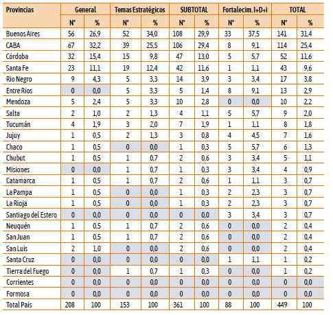 si se pretende aumentar la participación de las regiones extra Centro será necesario destinar esfuerzos más que proporcionales para el desarrollo de los sistemas provinciales, la radicación de investigadores/as y su dinámica de presentación a programas públicos de apoyo a la cyt (2018: 54).