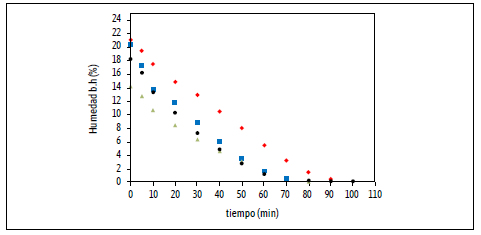 Figura 1. Secado de curvas a 65 °C de cápsulas de alginato con oea para los diferentes procesos (P1 ; P2 ; P3 ; P4)