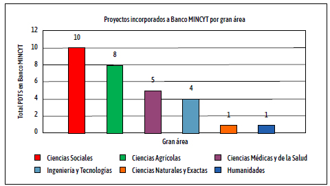 De los 36 proyectos financiados, y sobre la base de la decisión de la Subsecretaría de Articulación Científica y Tecnológica del ex mincyt, 29 fueron incorporados al Banco Nacional de pdts. Agrupados por las 6 grandes áreas establecidas por el mincyt para su postulación, la mayor cantidad de incorporaciones corresponde a Ciencias Sociales, mientras que Ciencias Exactas y Humanidades son las de menores cantidades, según se establece en el siguiente cuadro: