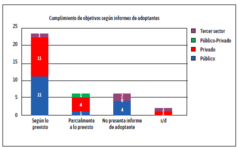 Por su parte, la mayor cantidad de informes no presentados corresponde a los adoptantes públicos, lo cual señala dificultades para la concreción de los resultados, que puede explicarse en parte por la falta de continuidad de los representantes en áreas claves del Estado y las modificaciones en el modelo de gestión, aun en administraciones en que no hubo cambios en el partido político en el gobierno