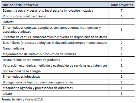 De los 35 Núcleos Socio Productivos del Plan Argentina Innovadora 2020, se presentaron proyectos relacionados con 14 núcleos, según la distribución que se muestra en la tabla que sigue a continuación. La mayoría de los proyectos se ubican en Economía social y desarrollo local para la innovación inclusiva y Producción animal tradicional: