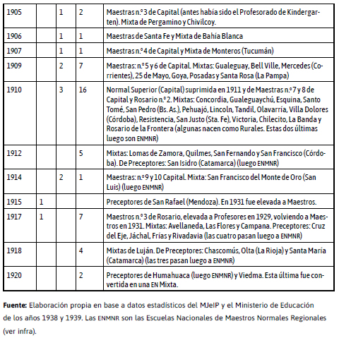 A continuación, observaremos en el Cuadro 1 el detalle de la sucesión de creaciones de en entre 1870 y 1920. Cabe advertir que si se suman todas las fundaciones, la cuenta da casi 100, pero deben restarse las en de varones que se cerraron y otras que fueron convertidas en escuelas comunes. Observando la tabla, se puede concluir que entre 1870 y 1920, es decir, en 50 años, se fundaron alrededor de 80 en y que más de la mitad fueron mixtas. Nótese que sólo en cuatro de los Territorios Nacionales se crearon en (La Pampa, Misiones, Chaco y Río Negro).