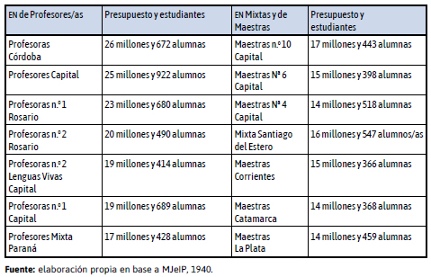 Acerca de las en que recibían el mayor presupuesto, de acuerdo a las estadísticas correspondientes al año 1939, había un conjunto de catorce en y de en de Profesores/as que concentraba los mayores montos, y de ellas, seis estaban ubicadas en la Capital Federal. Varias de estas en eran las más prestigiosas y demandadas, y eran consideradas establecimientos que formaban a las élites locales dentro del sistema público, como la en de La Plata o la de Profesores de Capital (Rodríguez, 2018a y 2019). Las en de Profesores/as y en Mixtas y de Maestras que más dinero recibían –en cifras redondas y por mes– eran las que se señalan en el Cuadro 2.
